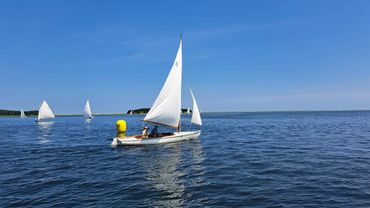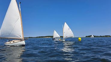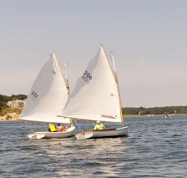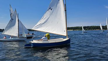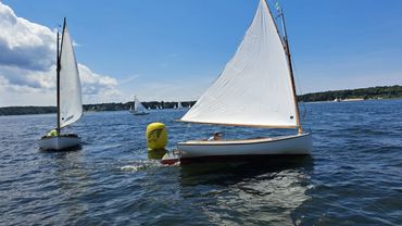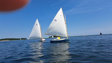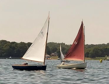 Saturday morning saw (again!) dire warnings of dense fog and a forecast for “calm wind becoming SSE 3-5 kts in the afternoon.” Yes, RC was a little worried. We arrived on the bay to find a solid 6 kts from the SE and set up a triangle course between the channel and south of Money Head. The day featured some excellent close racing. Everyone seems to be getting the hang of the new 3 minute starting sequence and all 5 boats in the >15' fleet hit the line right at the gun. During Race 1, our initial 6-7 kts decreasing to around 5 kts and the fleet split with some taking the left side and some the right. Taking the left side up by Hog Island was favored for all three races due to less adverse current, less chop, and consistent breeze. This allowed Athena and Ripple to pull ahead in Race 1. Ripple was first to the finish line with Athena and Azure Leisure coming in together for a photo finish. Azure Leisure took 2nd by a hair, as Mike shot the line at *just* the right moment.